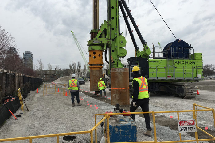 The Phase 1 portion of work consisted of installing nearly 1500 interlocking secant piles of either 1000mm or 1180mm diameters into the bedrock a minimum of 3m. The depth of each secant pile ranged from 20m to 45m. Phase 2 included interlocking 1000-1180mm diameter piles at the North and South of the project which permitted a cantilevered excavation. Where the structural element of the wall was not required, the cut-off was instead achieved with a cement-bentonite slurry.